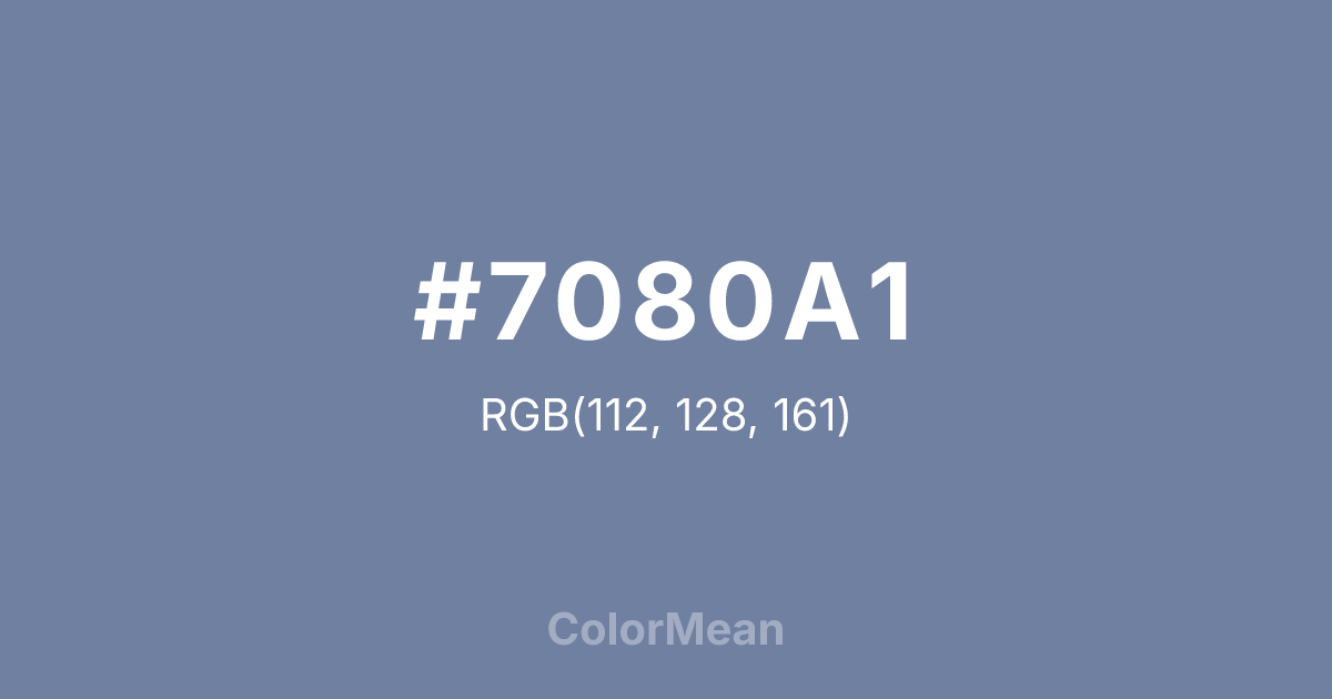 #7080A1 RGB value is (112, 128, 161). The hex color red value is 112, green is 128, and blue is 161. Its HSL format shows a hue of 220°, saturation of 21 percent, and lightness of 54 percent. The CMYK process values are 30 percent, 20 percent, 0 percent, 37 percent.