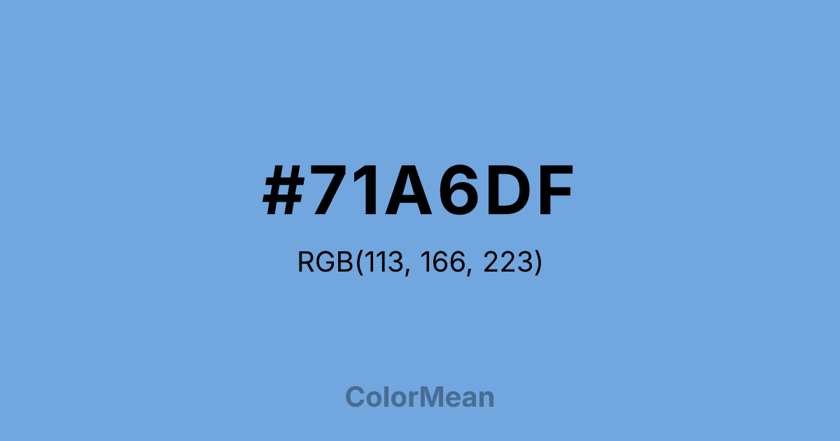 #71A6DF RGB value is (113, 166, 223). The hex color red value is 113, green is 166, and blue is 223. Its HSL format shows a hue of 211°, saturation of 63 percent, and lightness of 66 percent. The CMYK process values are 49 percent, 26 percent, 0 percent, 13 percent.
