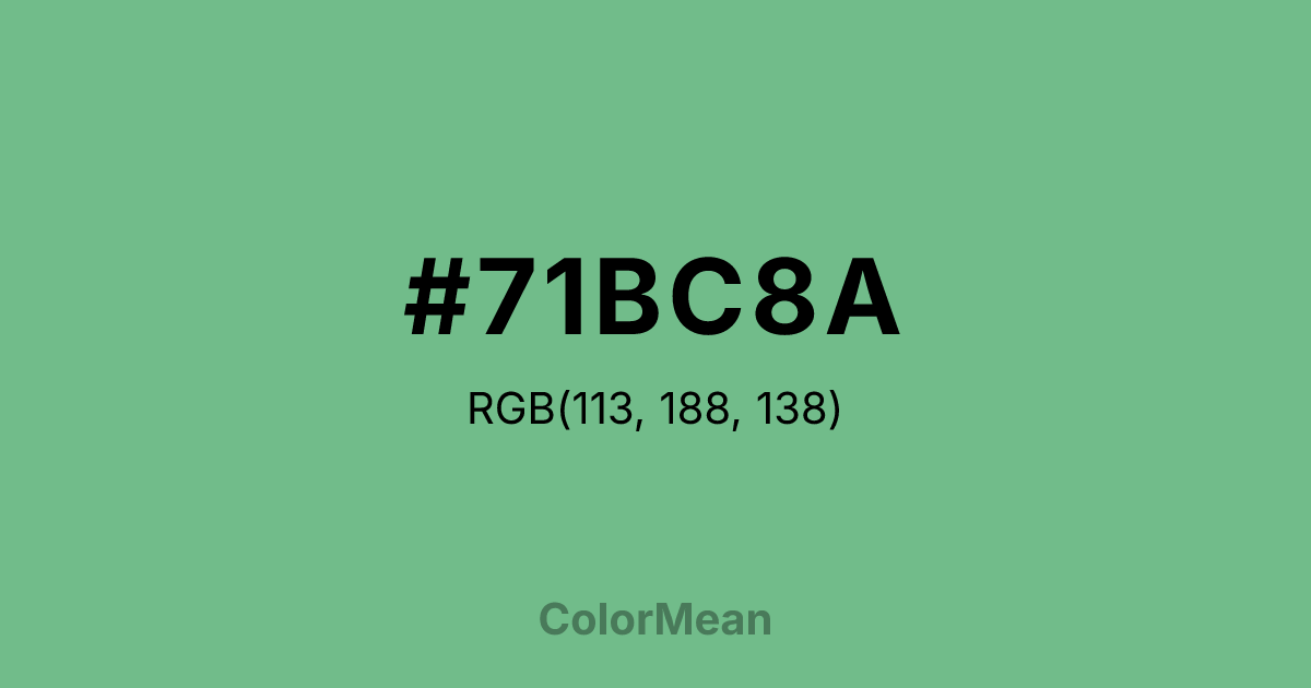 #71BC8A RGB value is (113, 188, 138). The hex color red value is 113, green is 188, and blue is 138. Its HSL format shows a hue of 140°, saturation of 36 percent, and lightness of 59 percent. The CMYK process values are 40 percent, 0 percent, 27 percent, 26 percent.