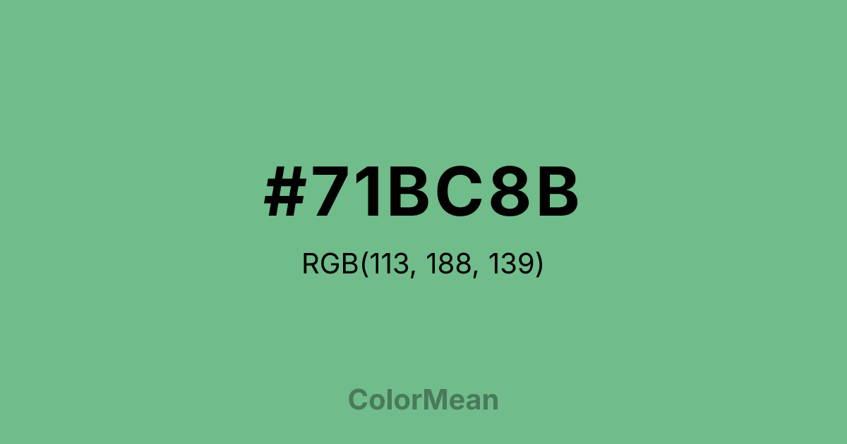 #71BC8B RGB value is (113, 188, 139). The hex color red value is 113, green is 188, and blue is 139. Its HSL format shows a hue of 141°, saturation of 36 percent, and lightness of 59 percent. The CMYK process values are 40 percent, 0 percent, 26 percent, 26 percent.