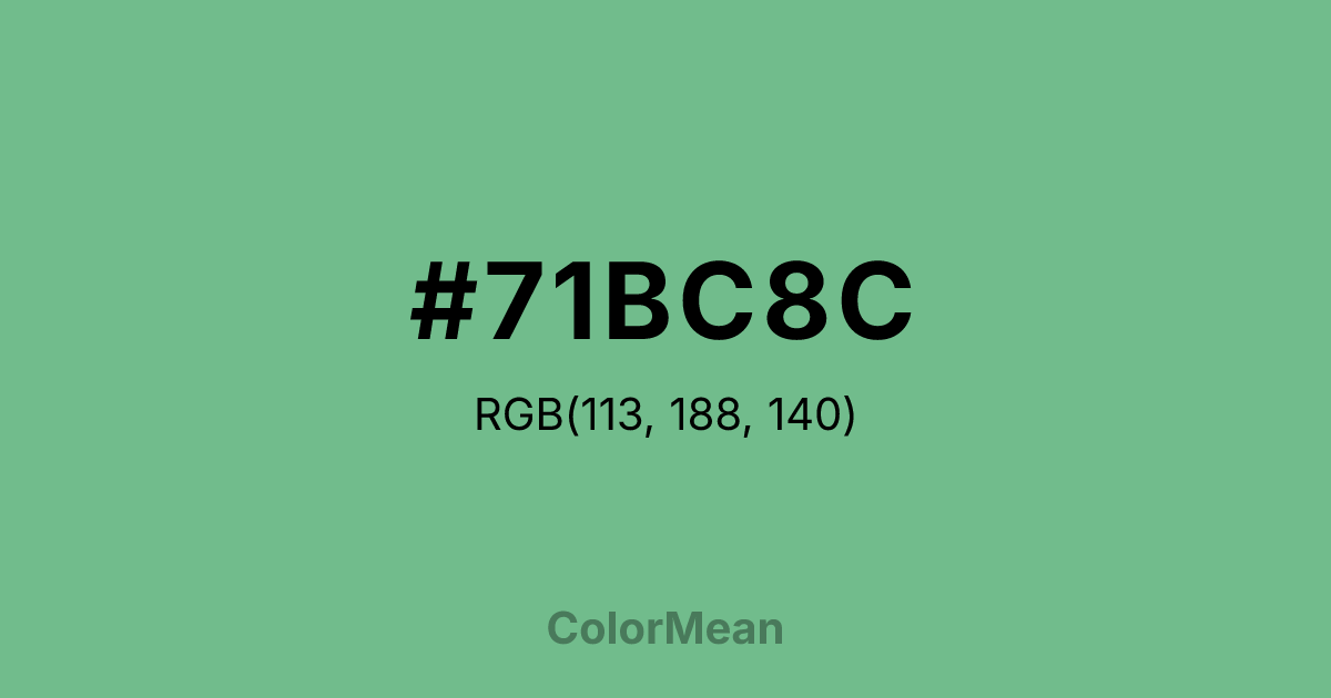 #71BC8C RGB value is (113, 188, 140). The hex color red value is 113, green is 188, and blue is 140. Its HSL format shows a hue of 142°, saturation of 36 percent, and lightness of 59 percent. The CMYK process values are 40 percent, 0 percent, 26 percent, 26 percent.