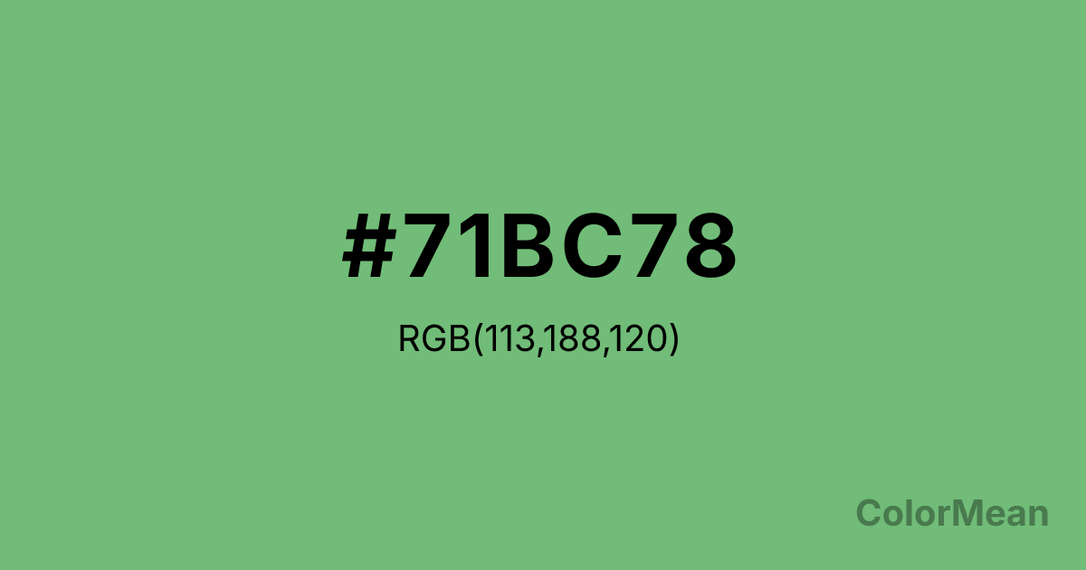 Fern (#71BC78) RGB value is (113, 188, 120). The hex color red value is 113, green is 188, and blue is 120. Its HSL format shows a hue of 126°, saturation of 36 percent, and lightness of 59 percent. The CMYK process values are 40 percent, 0 percent, 36 percent, 26 percent.