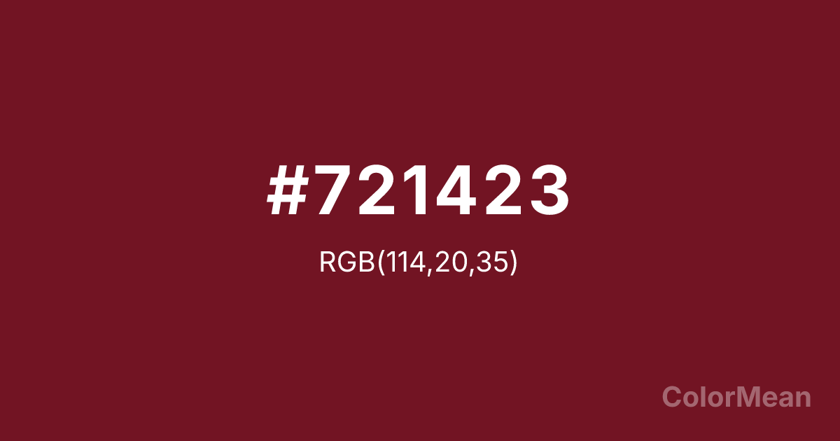 #721423 RGB value is (114, 20, 35). The hex color red value is 114, green is 20, and blue is 35. Its HSL format shows a hue of 350°, saturation of 70 percent, and lightness of 26 percent. The CMYK process values are 0 percent, 82 percent, 69 percent, 55 percent.