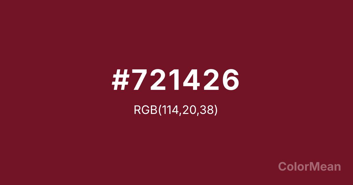 #721426 RGB value is (114, 20, 38). The hex color red value is 114, green is 20, and blue is 38. Its HSL format shows a hue of 349°, saturation of 70 percent, and lightness of 26 percent. The CMYK process values are 0 percent, 82 percent, 67 percent, 55 percent.