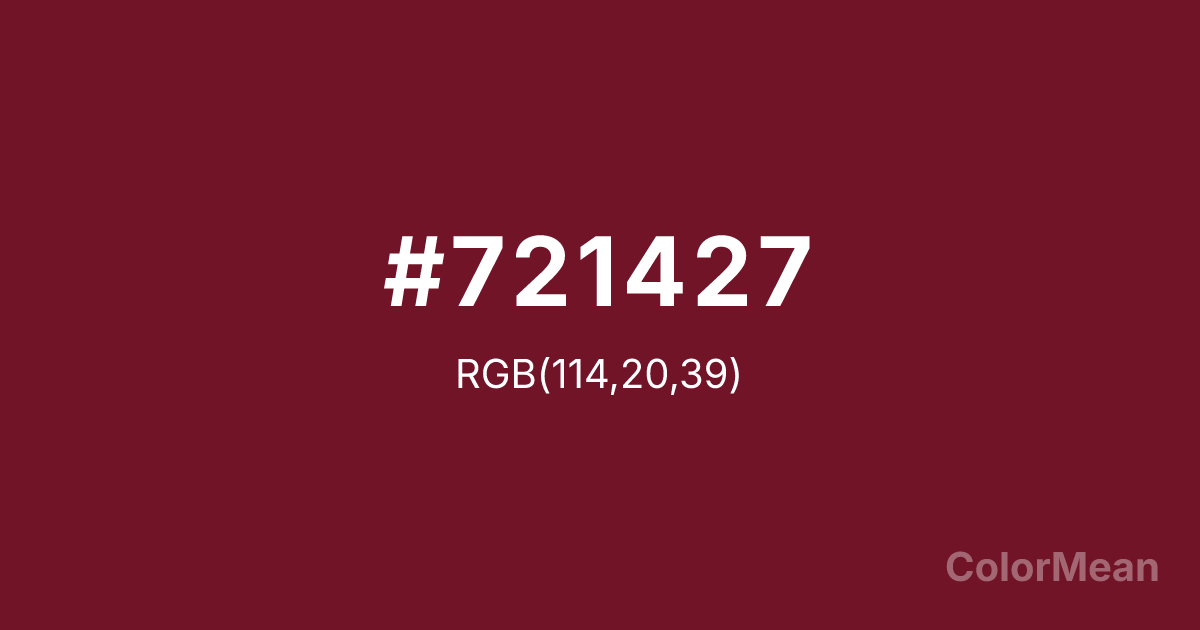 #721427 RGB value is (114, 20, 39). The hex color red value is 114, green is 20, and blue is 39. Its HSL format shows a hue of 348°, saturation of 70 percent, and lightness of 26 percent. The CMYK process values are 0 percent, 82 percent, 66 percent, 55 percent.