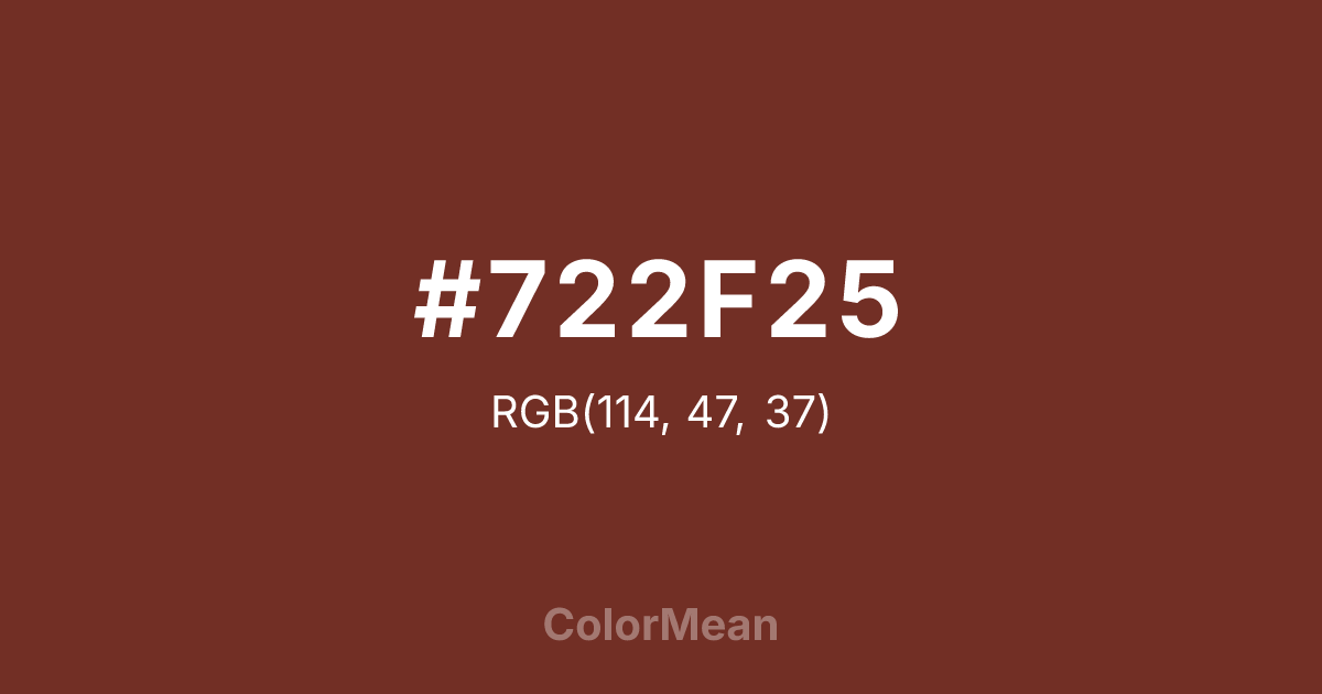 #722F25 RGB value is (114, 47, 37). The hex color red value is 114, green is 47, and blue is 37. Its HSL format shows a hue of 8°, saturation of 51 percent, and lightness of 30 percent. The CMYK process values are 0 percent, 59 percent, 68 percent, 55 percent.