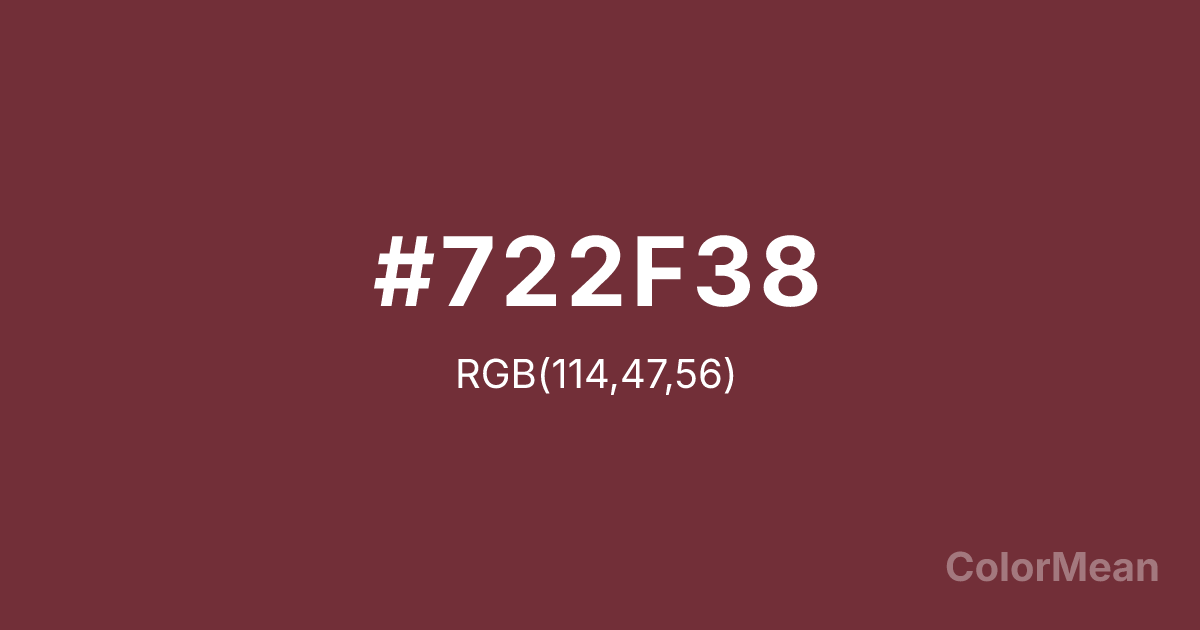 #722F38 RGB value is (114, 47, 56). The hex color red value is 114, green is 47, and blue is 56. Its HSL format shows a hue of 352°, saturation of 42 percent, and lightness of 32 percent. The CMYK process values are 0 percent, 59 percent, 51 percent, 55 percent.