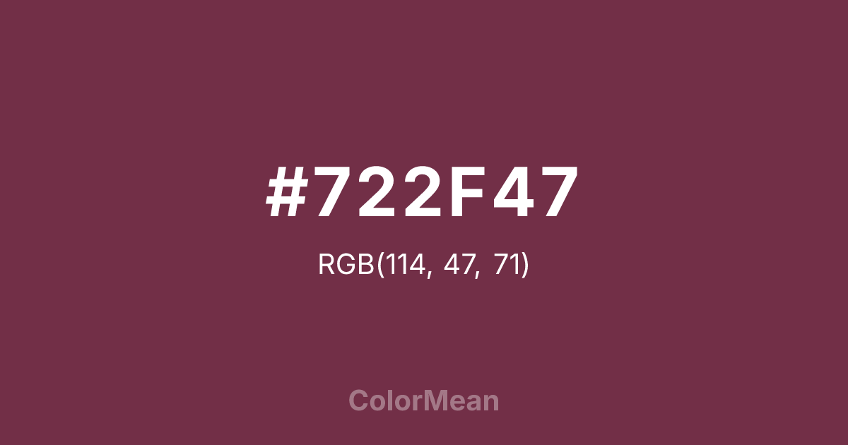 #722F47 RGB value is (114, 47, 71). The hex color red value is 114, green is 47, and blue is 71. Its HSL format shows a hue of 339°, saturation of 42 percent, and lightness of 32 percent. The CMYK process values are 0 percent, 59 percent, 38 percent, 55 percent.