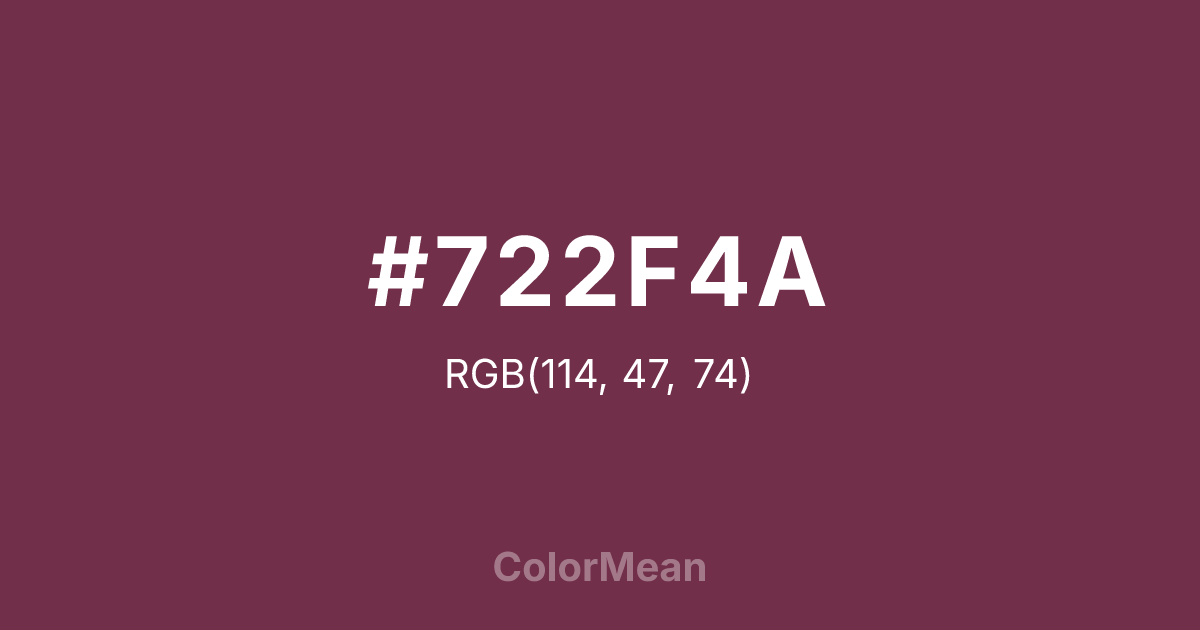 #722F4A RGB value is (114, 47, 74). The hex color red value is 114, green is 47, and blue is 74. Its HSL format shows a hue of 336°, saturation of 42 percent, and lightness of 32 percent. The CMYK process values are 0 percent, 59 percent, 35 percent, 55 percent.