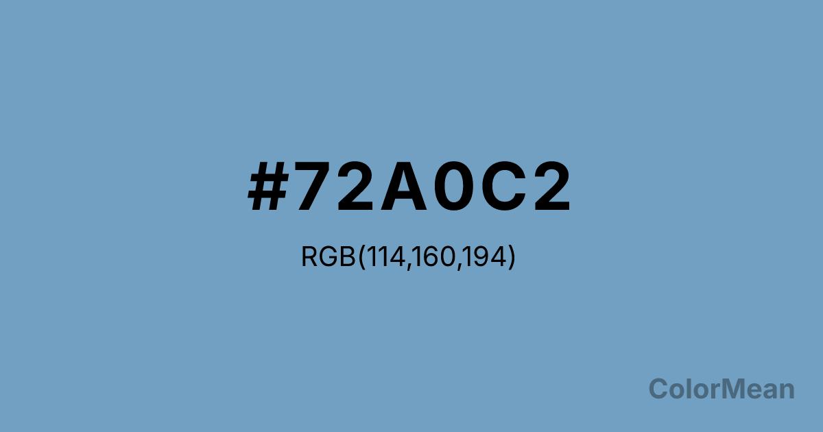 #72A0C2 RGB value is (114, 160, 194). The hex color red value is 114, green is 160, and blue is 194. Its HSL format shows a hue of 206°, saturation of 40 percent, and lightness of 60 percent. The CMYK process values are 41 percent, 18 percent, 0 percent, 24 percent.