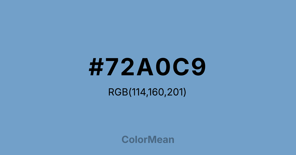 #72A0C9 RGB value is (114, 160, 201). The hex color red value is 114, green is 160, and blue is 201. Its HSL format shows a hue of 208°, saturation of 45 percent, and lightness of 62 percent. The CMYK process values are 43 percent, 20 percent, 0 percent, 21 percent.