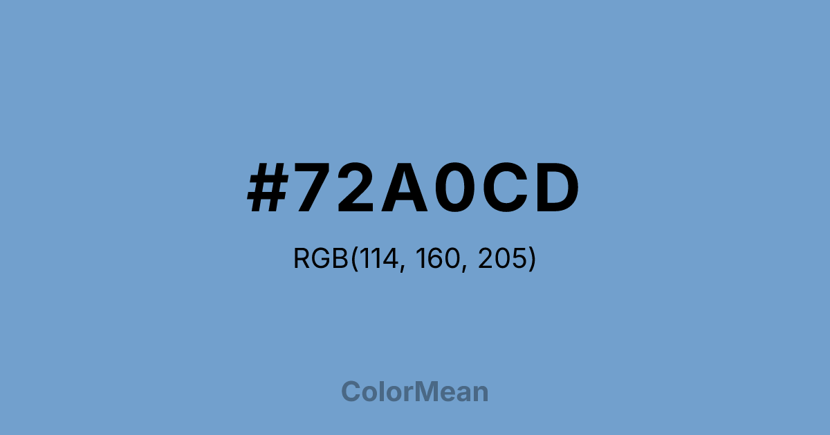 #72A0CD RGB value is (114, 160, 205). The hex color red value is 114, green is 160, and blue is 205. Its HSL format shows a hue of 210°, saturation of 48 percent, and lightness of 63 percent. The CMYK process values are 44 percent, 22 percent, 0 percent, 20 percent.