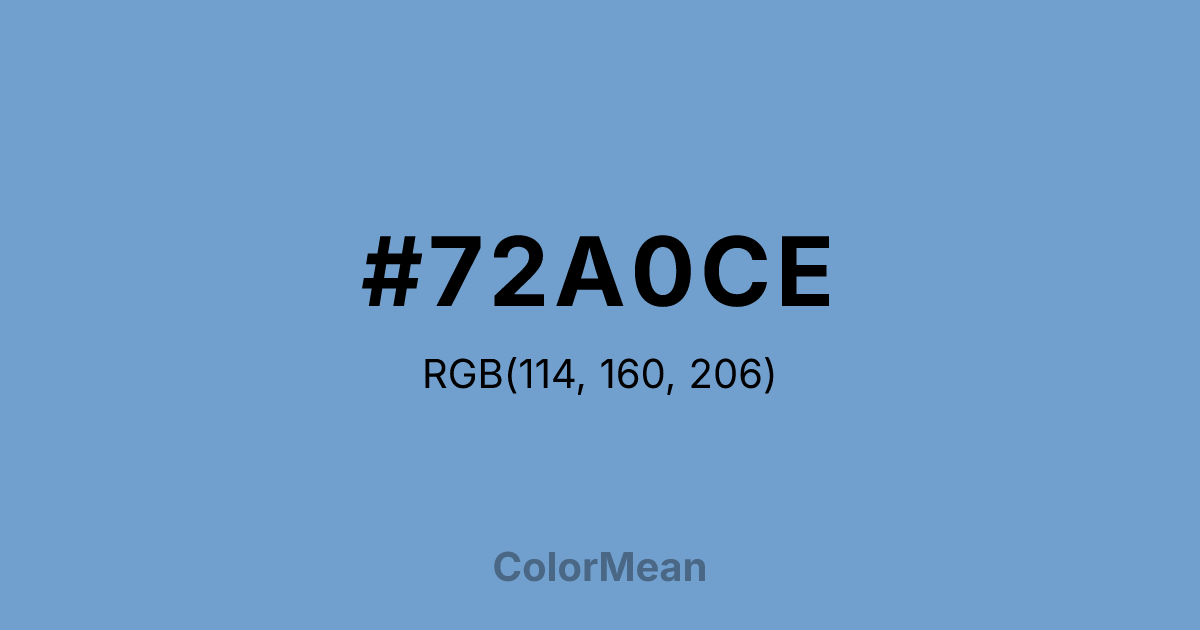 #72A0CE RGB value is (114, 160, 206). The hex color red value is 114, green is 160, and blue is 206. Its HSL format shows a hue of 210°, saturation of 48 percent, and lightness of 63 percent. The CMYK process values are 45 percent, 22 percent, 0 percent, 19 percent.