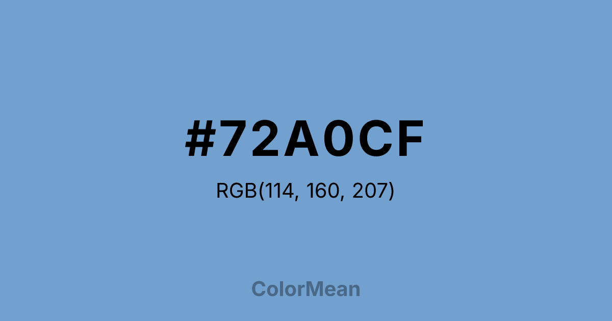 #72A0CF RGB value is (114, 160, 207). The hex color red value is 114, green is 160, and blue is 207. Its HSL format shows a hue of 210°, saturation of 49 percent, and lightness of 63 percent. The CMYK process values are 45 percent, 23 percent, 0 percent, 19 percent.