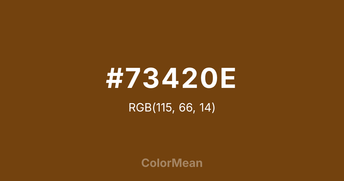 #73420E RGB value is (115, 66, 14). The hex color red value is 115, green is 66, and blue is 14. Its HSL format shows a hue of 31°, saturation of 78 percent, and lightness of 25 percent. The CMYK process values are 0 percent, 43 percent, 88 percent, 55 percent.