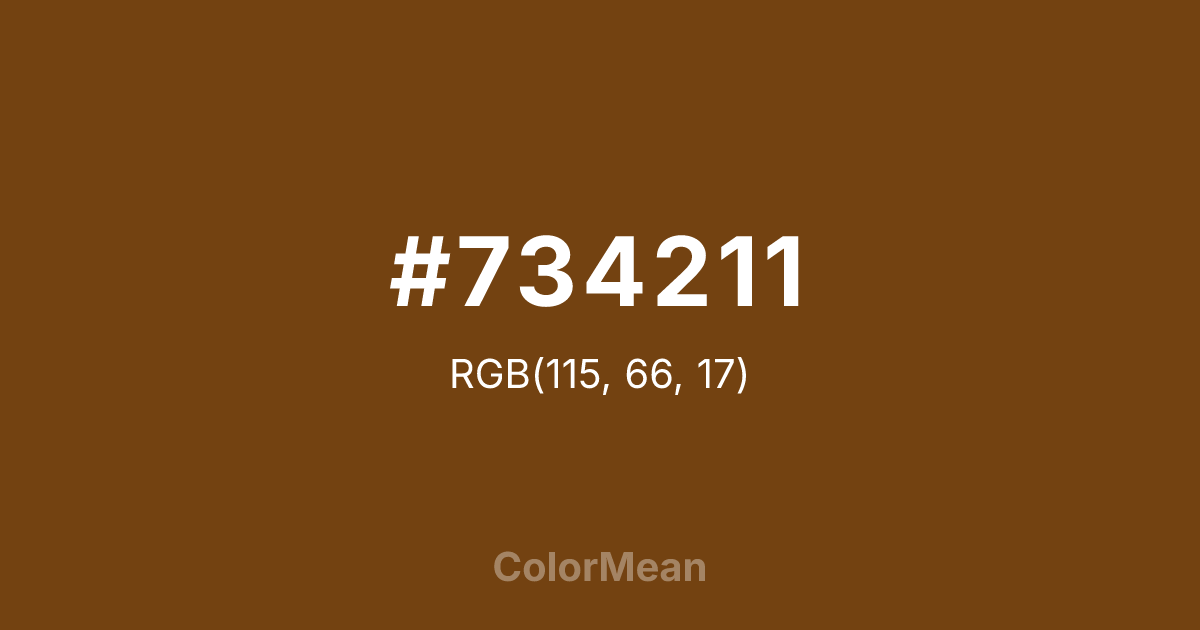 #734211 RGB value is (115, 66, 17). The hex color red value is 115, green is 66, and blue is 17. Its HSL format shows a hue of 30°, saturation of 74 percent, and lightness of 26 percent. The CMYK process values are 0 percent, 43 percent, 85 percent, 55 percent.
