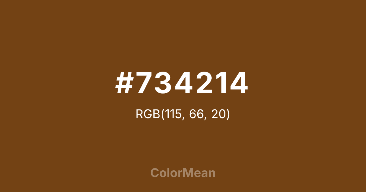 #734214 RGB value is (115, 66, 20). The hex color red value is 115, green is 66, and blue is 20. Its HSL format shows a hue of 29°, saturation of 70 percent, and lightness of 26 percent. The CMYK process values are 0 percent, 43 percent, 83 percent, 55 percent.