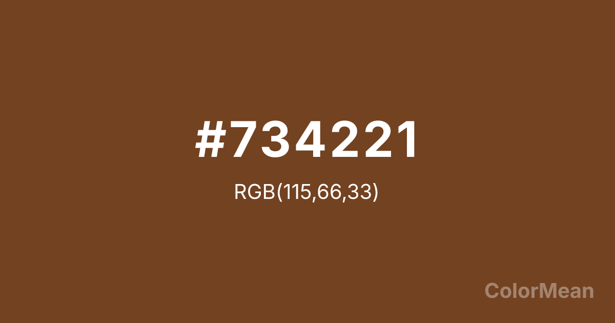 #734221 RGB value is (115, 66, 33). The hex color red value is 115, green is 66, and blue is 33. Its HSL format shows a hue of 24°, saturation of 55 percent, and lightness of 29 percent. The CMYK process values are 0 percent, 43 percent, 71 percent, 55 percent.
