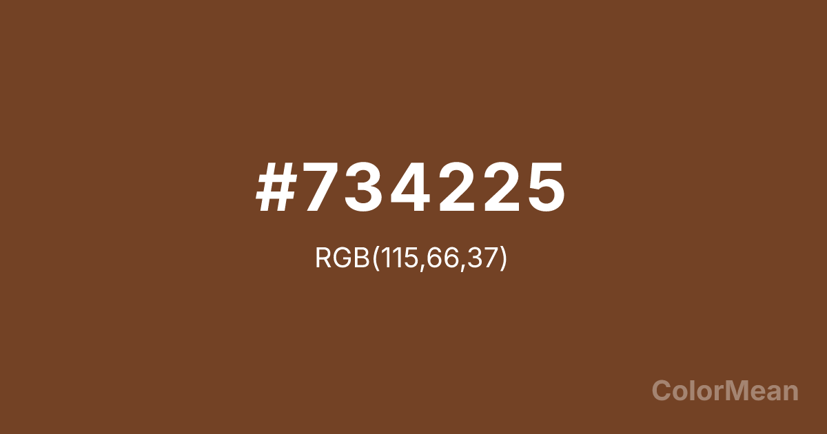 #734225 RGB value is (115, 66, 37). The hex color red value is 115, green is 66, and blue is 37. Its HSL format shows a hue of 22°, saturation of 51 percent, and lightness of 30 percent. The CMYK process values are 0 percent, 43 percent, 68 percent, 55 percent.