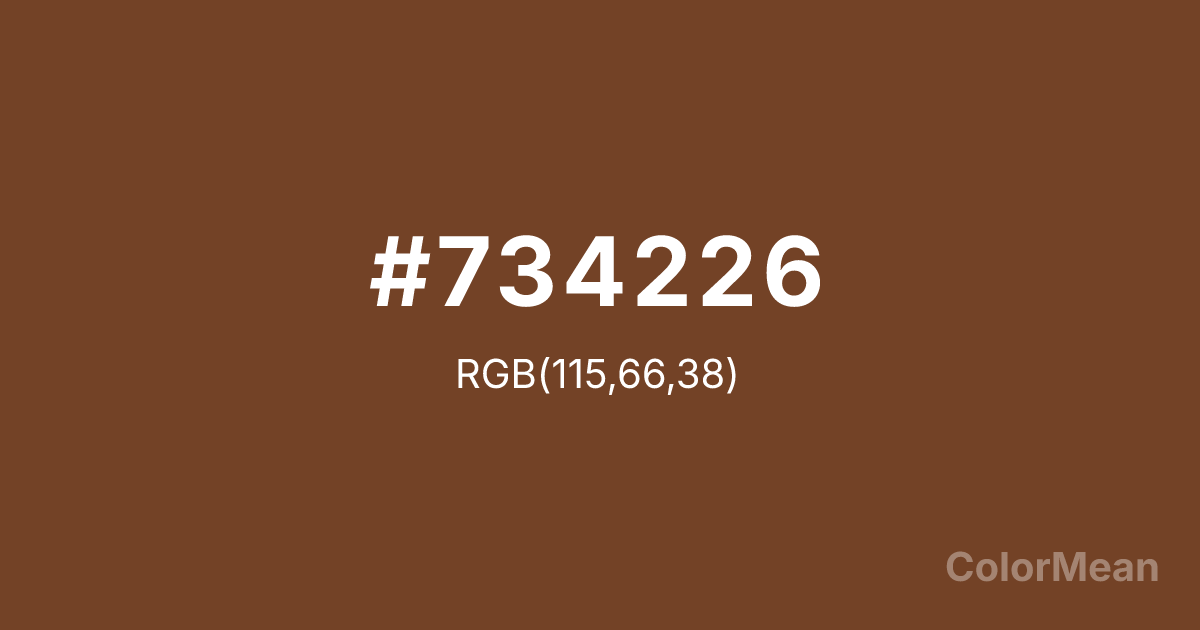 #734226 RGB value is (115, 66, 38). The hex color red value is 115, green is 66, and blue is 38. Its HSL format shows a hue of 22°, saturation of 50 percent, and lightness of 30 percent. The CMYK process values are 0 percent, 43 percent, 67 percent, 55 percent.