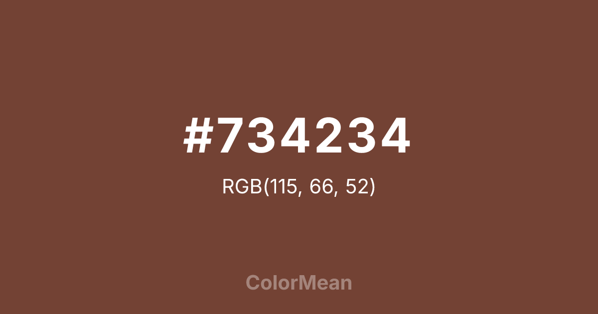 #734234 RGB value is (115, 66, 52). The hex color red value is 115, green is 66, and blue is 52. Its HSL format shows a hue of 13°, saturation of 38 percent, and lightness of 33 percent. The CMYK process values are 0 percent, 43 percent, 55 percent, 55 percent.