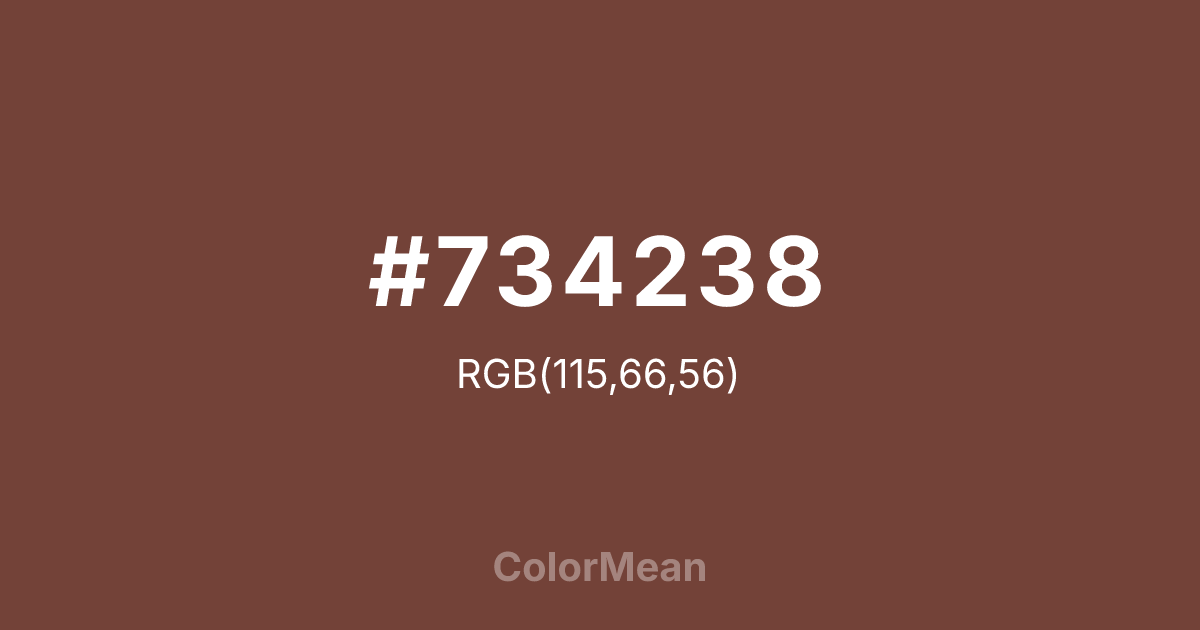#734238 RGB value is (115, 66, 56). The hex color red value is 115, green is 66, and blue is 56. Its HSL format shows a hue of 10°, saturation of 35 percent, and lightness of 34 percent. The CMYK process values are 0 percent, 43 percent, 51 percent, 55 percent.