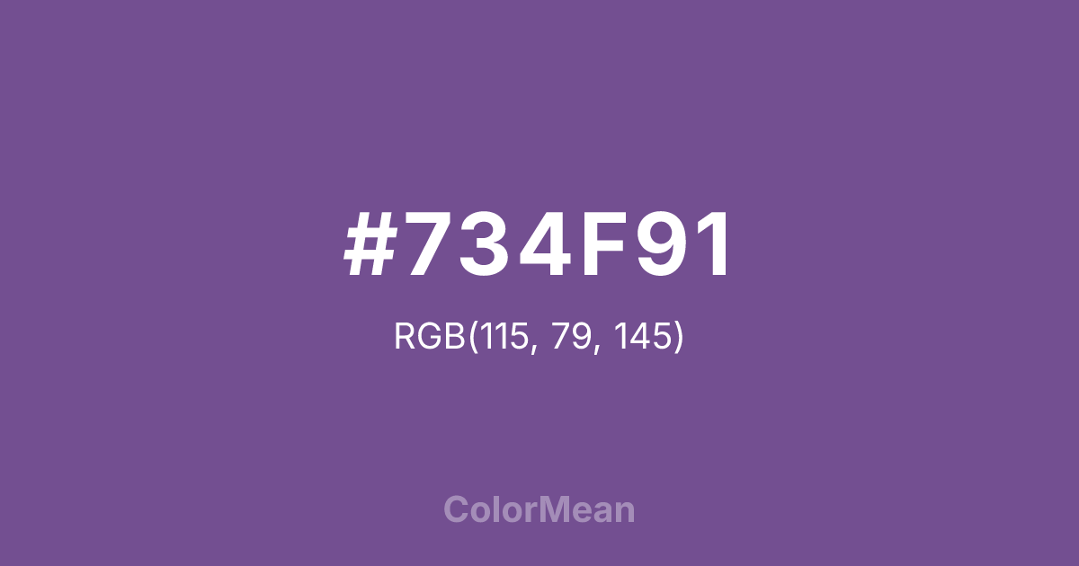 #734F91 RGB value is (115, 79, 145). The hex color red value is 115, green is 79, and blue is 145. Its HSL format shows a hue of 273°, saturation of 29 percent, and lightness of 44 percent. The CMYK process values are 21 percent, 46 percent, 0 percent, 43 percent.