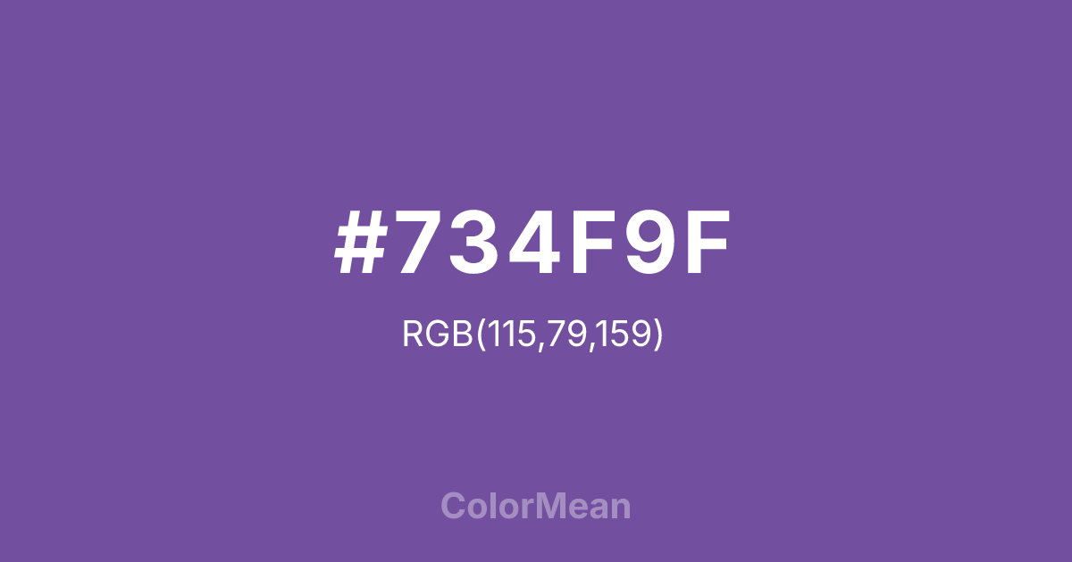 #734F9F RGB value is (115, 79, 159). The hex color red value is 115, green is 79, and blue is 159. Its HSL format shows a hue of 267°, saturation of 34 percent, and lightness of 47 percent. The CMYK process values are 28 percent, 50 percent, 0 percent, 38 percent.