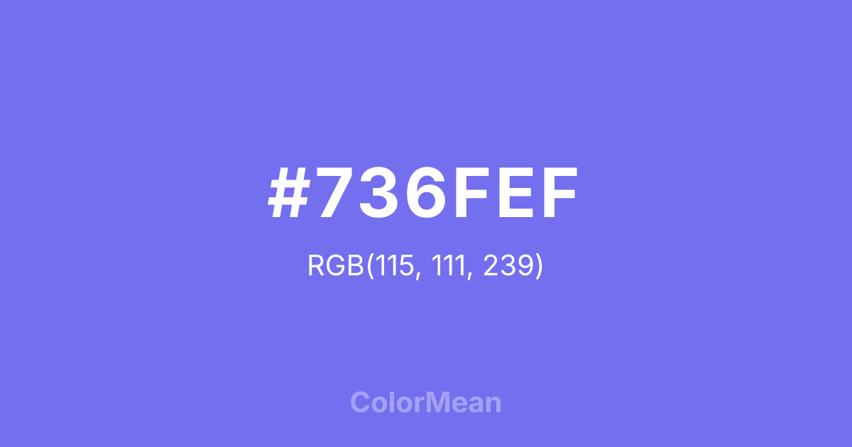 #736FEF RGB value is (115, 111, 239). The hex color red value is 115, green is 111, and blue is 239. Its HSL format shows a hue of 242°, saturation of 80 percent, and lightness of 69 percent. The CMYK process values are 52 percent, 54 percent, 0 percent, 6 percent.
