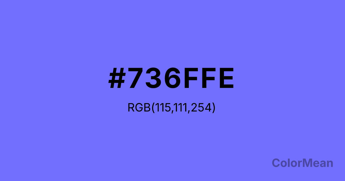 #736FFE RGB value is (115, 111, 254). The hex color red value is 115, green is 111, and blue is 254. Its HSL format shows a hue of 242°, saturation of 99 percent, and lightness of 72 percent. The CMYK process values are 55 percent, 56 percent, 0 percent, 0 percent.