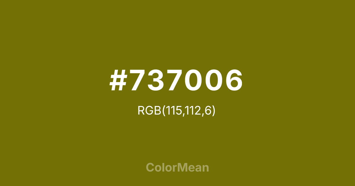 #737006 RGB value is (115, 112, 6). The hex color red value is 115, green is 112, and blue is 6. Its HSL format shows a hue of 58°, saturation of 90 percent, and lightness of 24 percent. The CMYK process values are 0 percent, 3 percent, 95 percent, 55 percent.