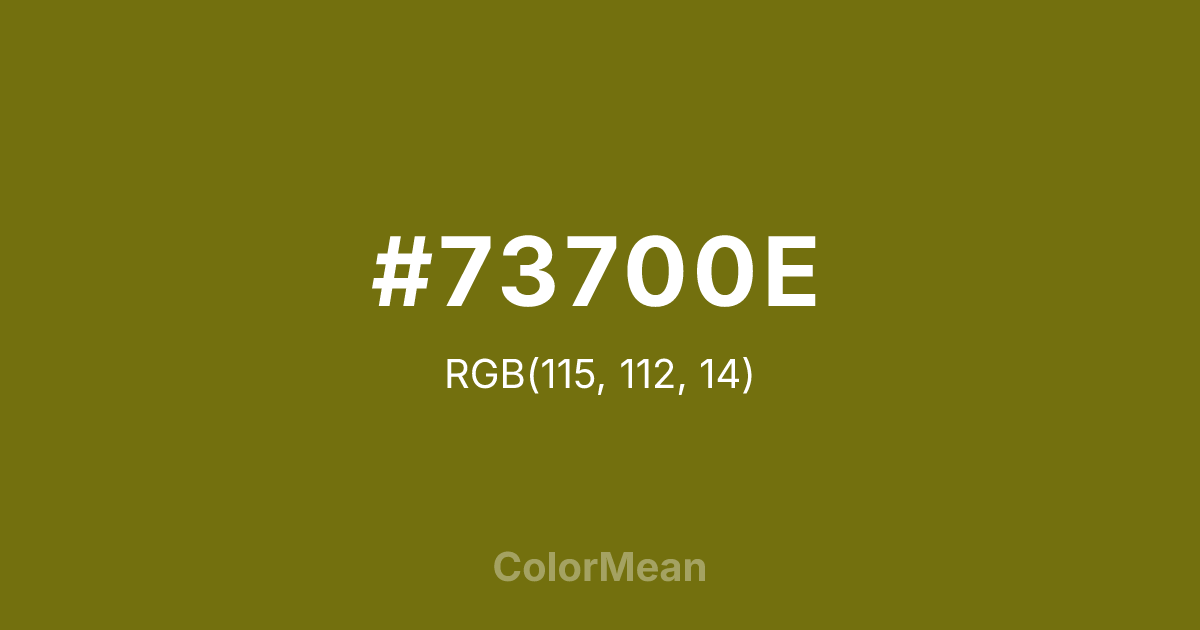 #73700E RGB value is (115, 112, 14). The hex color red value is 115, green is 112, and blue is 14. Its HSL format shows a hue of 58°, saturation of 78 percent, and lightness of 25 percent. The CMYK process values are 0 percent, 3 percent, 88 percent, 55 percent.