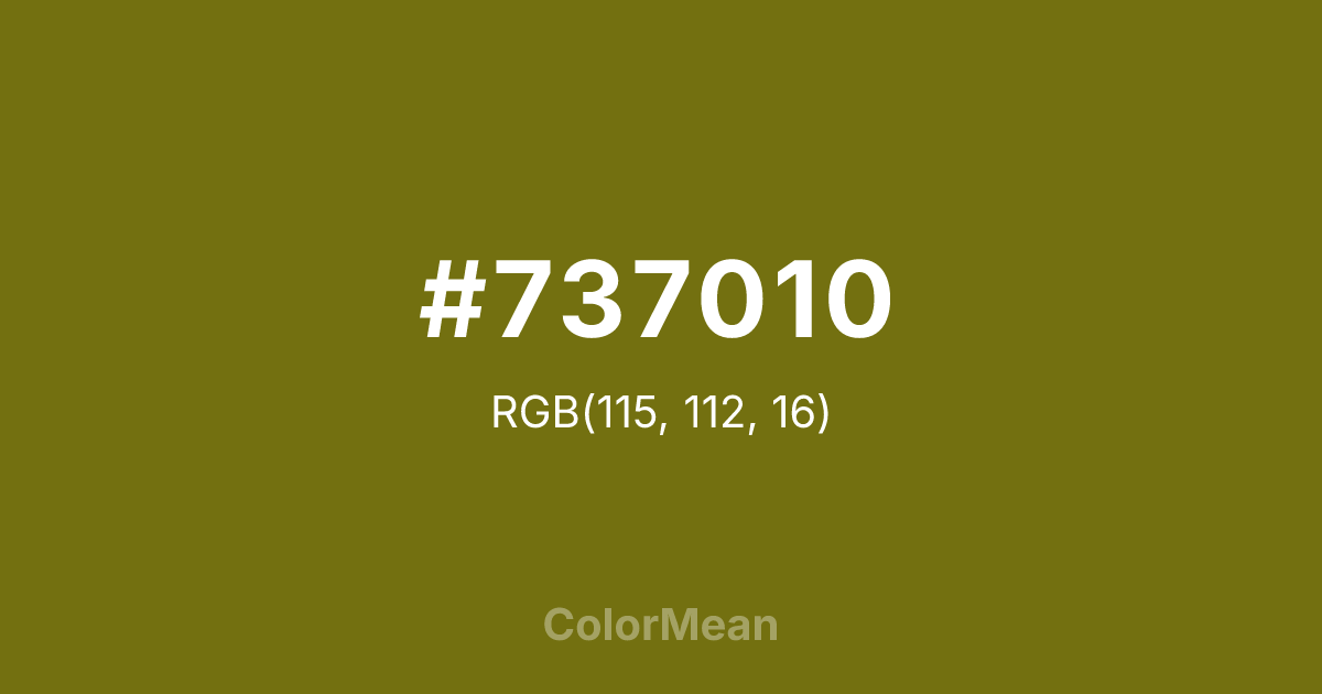 #737010 RGB value is (115, 112, 16). The hex color red value is 115, green is 112, and blue is 16. Its HSL format shows a hue of 58°, saturation of 76 percent, and lightness of 26 percent. The CMYK process values are 0 percent, 3 percent, 86 percent, 55 percent.