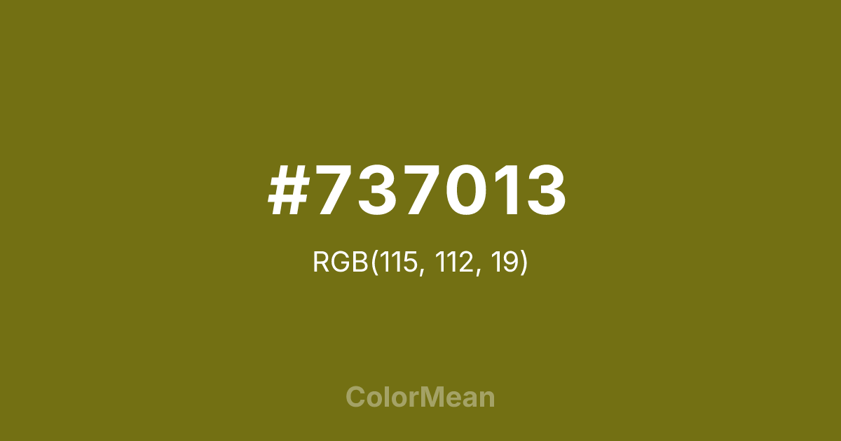 #737013 RGB value is (115, 112, 19). The hex color red value is 115, green is 112, and blue is 19. Its HSL format shows a hue of 58°, saturation of 72 percent, and lightness of 26 percent. The CMYK process values are 0 percent, 3 percent, 83 percent, 55 percent.