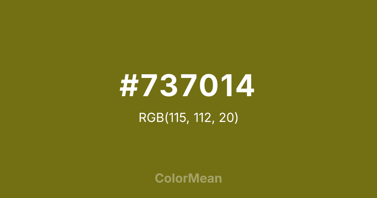 #737014 RGB value is (115, 112, 20). The hex color red value is 115, green is 112, and blue is 20. Its HSL format shows a hue of 58°, saturation of 70 percent, and lightness of 26 percent. The CMYK process values are 0 percent, 3 percent, 83 percent, 55 percent.