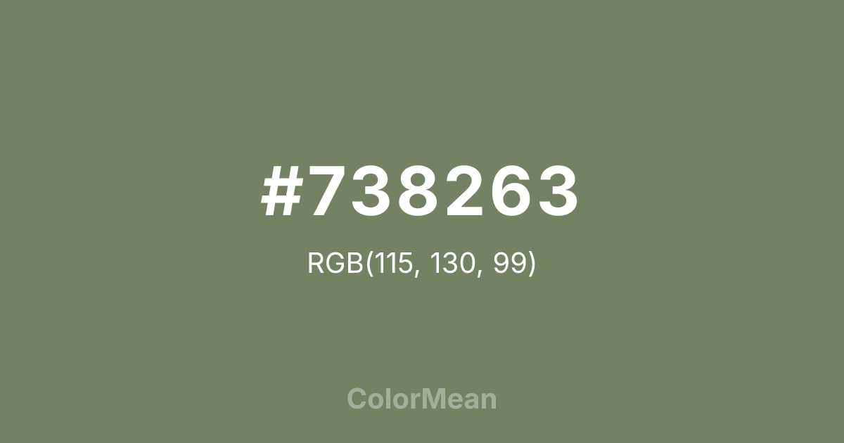 #738263 RGB value is (115, 130, 99). The hex color red value is 115, green is 130, and blue is 99. Its HSL format shows a hue of 89°, saturation of 14 percent, and lightness of 45 percent. The CMYK process values are 12 percent, 0 percent, 24 percent, 49 percent.