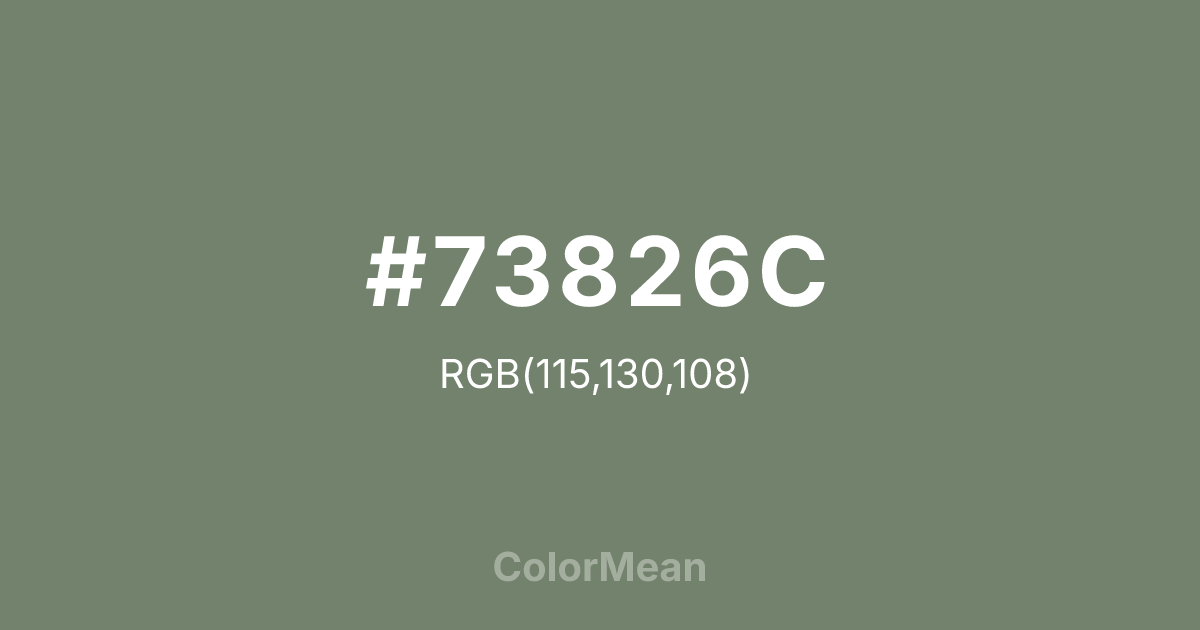 #73826C RGB value is (115, 130, 108). The hex color red value is 115, green is 130, and blue is 108. Its HSL format shows a hue of 101°, saturation of 9 percent, and lightness of 47 percent. The CMYK process values are 12 percent, 0 percent, 17 percent, 49 percent.
