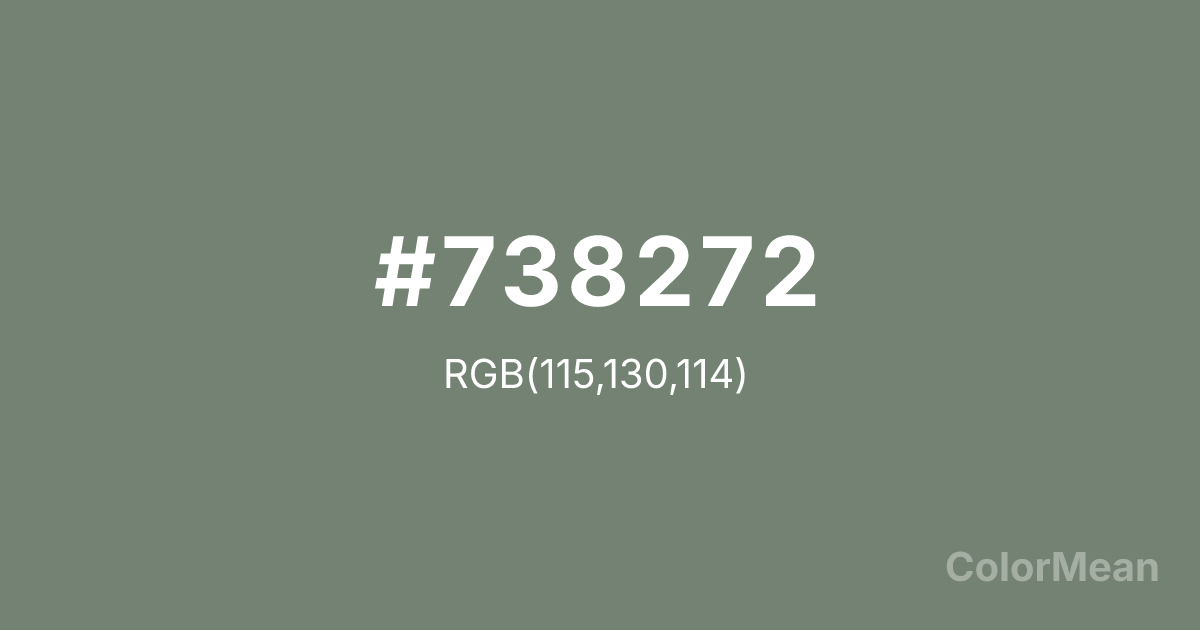 #738272 RGB value is (115, 130, 114). The hex color red value is 115, green is 130, and blue is 114. Its HSL format shows a hue of 116°, saturation of 7 percent, and lightness of 48 percent. The CMYK process values are 12 percent, 0 percent, 12 percent, 49 percent.