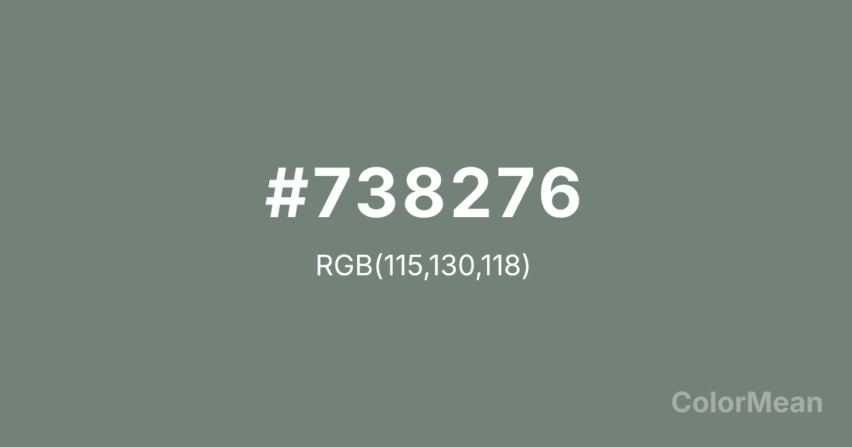 Smoke (#738276) RGB value is (115, 130, 118). The hex color red value is 115, green is 130, and blue is 118. Its HSL format shows a hue of 132°, saturation of 6 percent, and lightness of 48 percent. The CMYK process values are 12 percent, 0 percent, 9 percent, 49 percent.