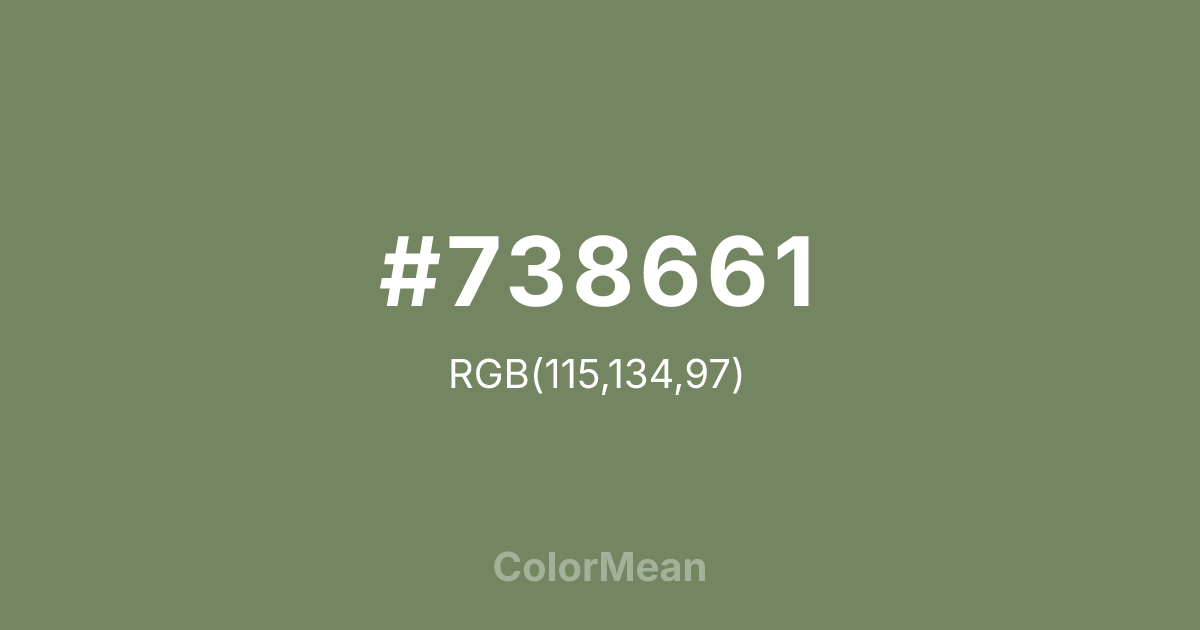 #738661 RGB value is (115, 134, 97). The hex color red value is 115, green is 134, and blue is 97. Its HSL format shows a hue of 91°, saturation of 16 percent, and lightness of 45 percent. The CMYK process values are 14 percent, 0 percent, 28 percent, 47 percent.