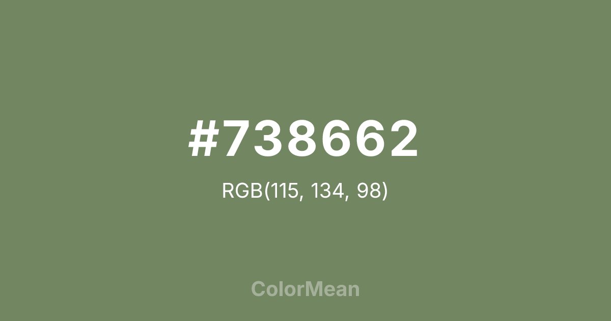 #738662 RGB value is (115, 134, 98). The hex color red value is 115, green is 134, and blue is 98. Its HSL format shows a hue of 92°, saturation of 16 percent, and lightness of 45 percent. The CMYK process values are 14 percent, 0 percent, 27 percent, 47 percent.