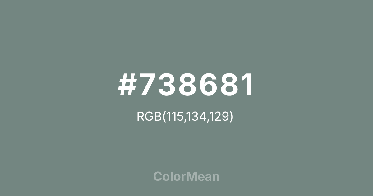 #738681 RGB value is (115, 134, 129). The hex color red value is 115, green is 134, and blue is 129. Its HSL format shows a hue of 164°, saturation of 8 percent, and lightness of 49 percent. The CMYK process values are 14 percent, 0 percent, 4 percent, 47 percent.