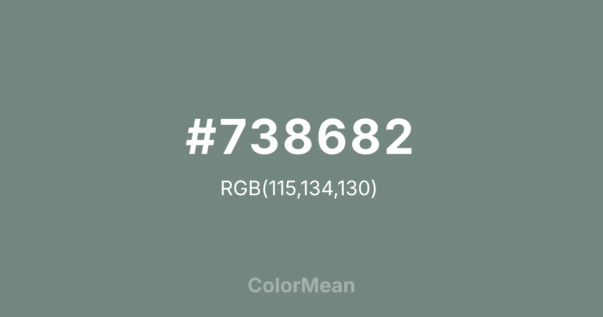#738682 RGB value is (115, 134, 130). The hex color red value is 115, green is 134, and blue is 130. Its HSL format shows a hue of 167°, saturation of 8 percent, and lightness of 49 percent. The CMYK process values are 14 percent, 0 percent, 3 percent, 47 percent.