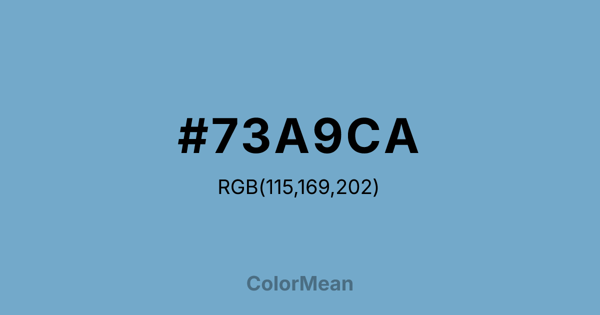 #73A9CA RGB value is (115, 169, 202). The hex color red value is 115, green is 169, and blue is 202. Its HSL format shows a hue of 203°, saturation of 45 percent, and lightness of 62 percent. The CMYK process values are 43 percent, 16 percent, 0 percent, 21 percent.