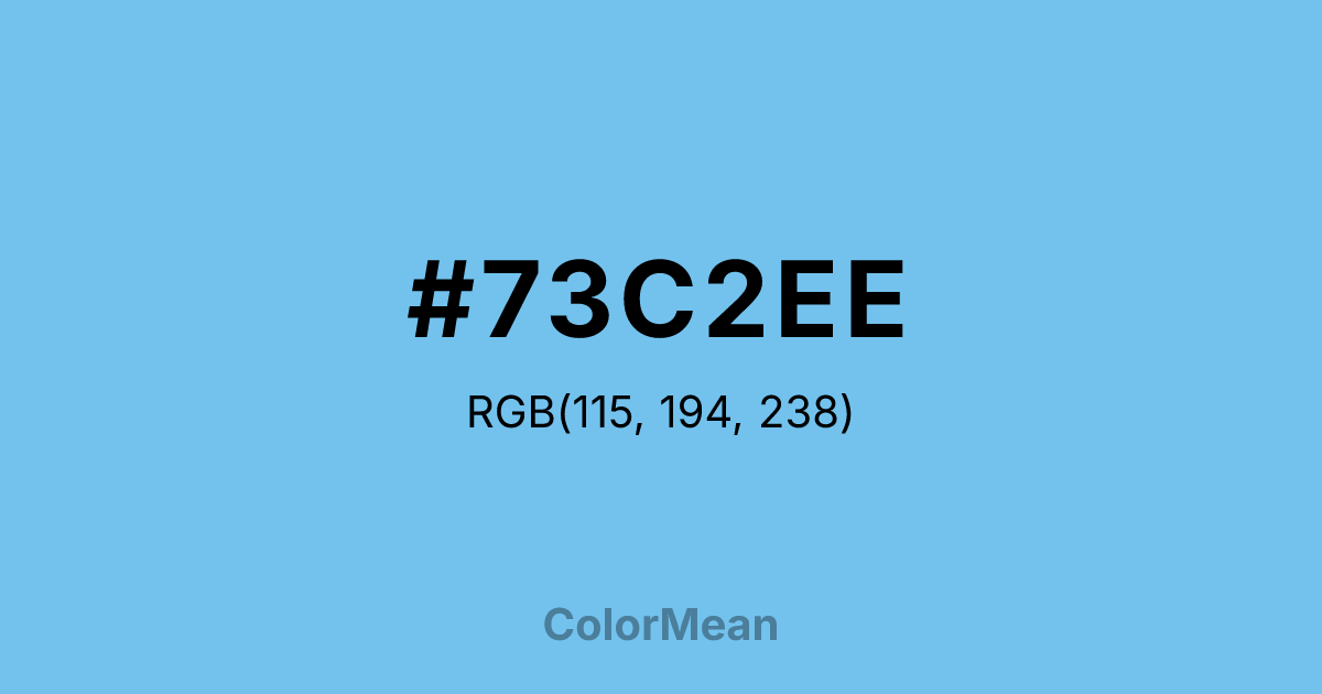 #73C2EE RGB value is (115, 194, 238). The hex color red value is 115, green is 194, and blue is 238. Its HSL format shows a hue of 201°, saturation of 78 percent, and lightness of 69 percent. The CMYK process values are 52 percent, 18 percent, 0 percent, 7 percent.