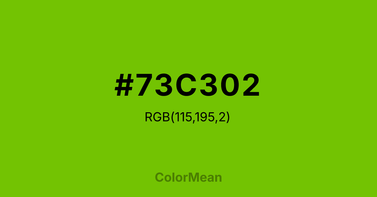 #73C302 RGB value is (115, 195, 2). The hex color red value is 115, green is 195, and blue is 2. Its HSL format shows a hue of 85°, saturation of 98 percent, and lightness of 39 percent. The CMYK process values are 41 percent, 0 percent, 99 percent, 24 percent.