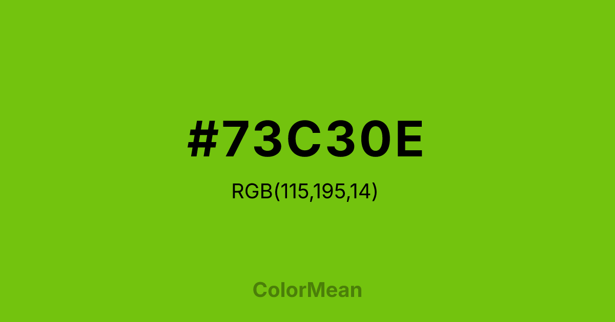 #73C30E RGB value is (115, 195, 14). The hex color red value is 115, green is 195, and blue is 14. Its HSL format shows a hue of 87°, saturation of 87 percent, and lightness of 41 percent. The CMYK process values are 41 percent, 0 percent, 93 percent, 24 percent.