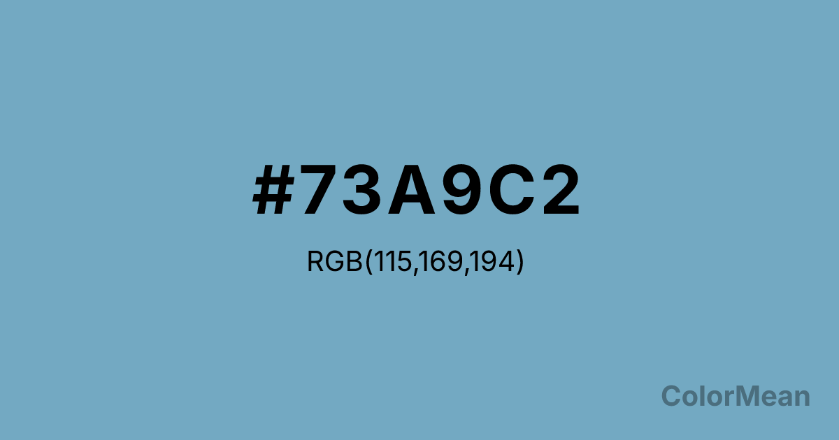 Moonstone Blue (#73A9C2) RGB value is (115, 169, 194). The hex color red value is 115, green is 169, and blue is 194. Its HSL format shows a hue of 199°, saturation of 39 percent, and lightness of 61 percent. The CMYK process values are 41 percent, 13 percent, 0 percent, 24 percent.