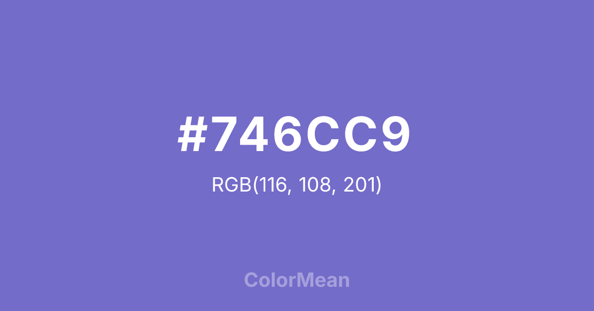 #746CC9 RGB value is (116, 108, 201). The hex color red value is 116, green is 108, and blue is 201. Its HSL format shows a hue of 245°, saturation of 46 percent, and lightness of 61 percent. The CMYK process values are 42 percent, 46 percent, 0 percent, 21 percent.