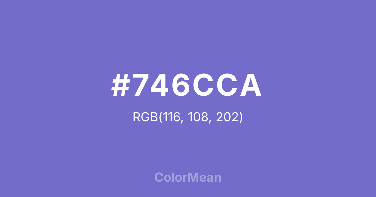 #746CCA RGB value is (116, 108, 202). The hex color red value is 116, green is 108, and blue is 202. Its HSL format shows a hue of 245°, saturation of 47 percent, and lightness of 61 percent. The CMYK process values are 43 percent, 47 percent, 0 percent, 21 percent.